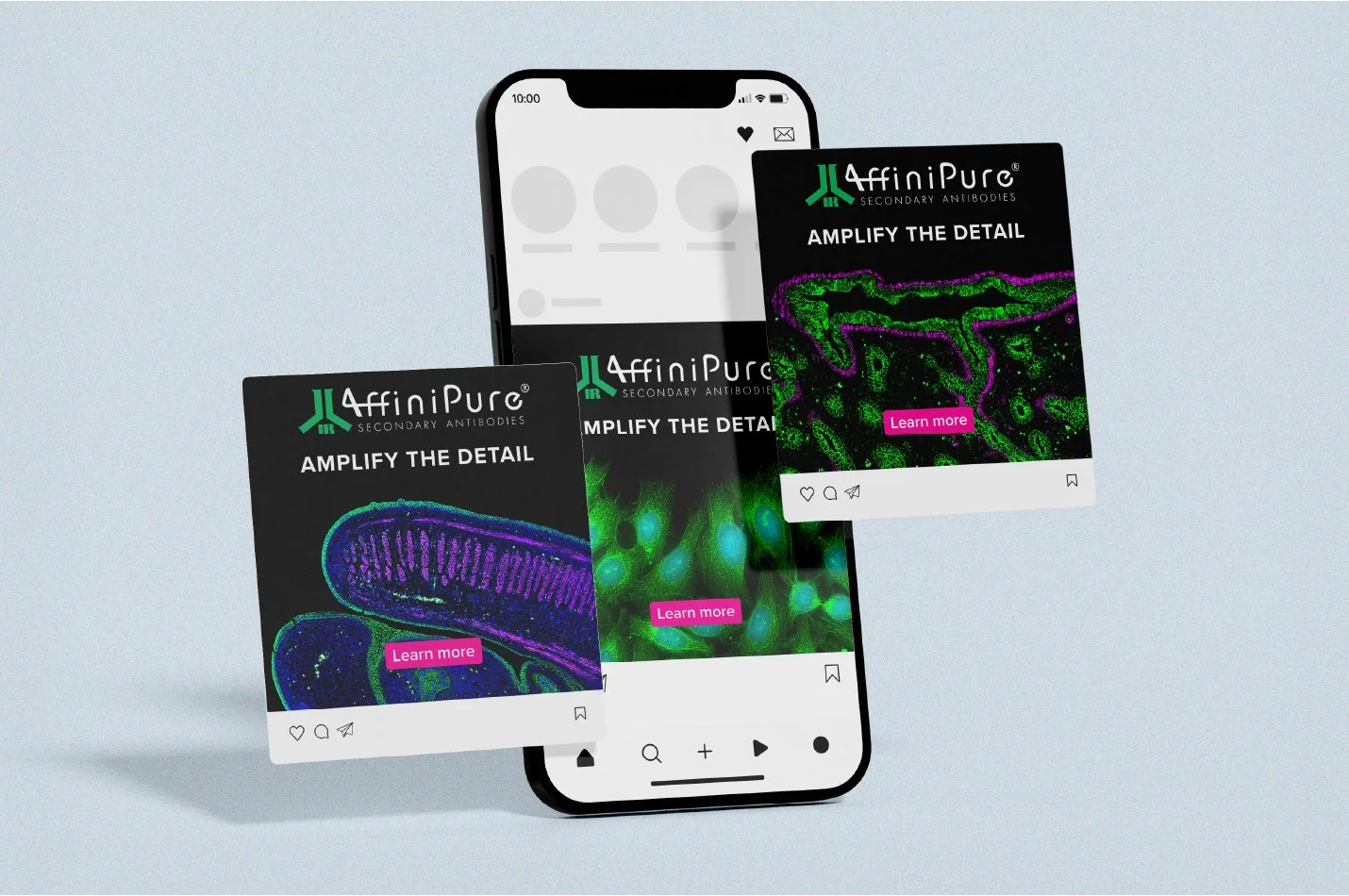 For print and digital ads I chose to center fluorescent microscopy images that can be created with AffiniPure antibodies. I was tasked with coming up with two custom illustrated designs for t-shirts that would start conversations and facilitate lead generation at scientific exhibitions. The t-shirts disappeared almost as fast as we could print them.