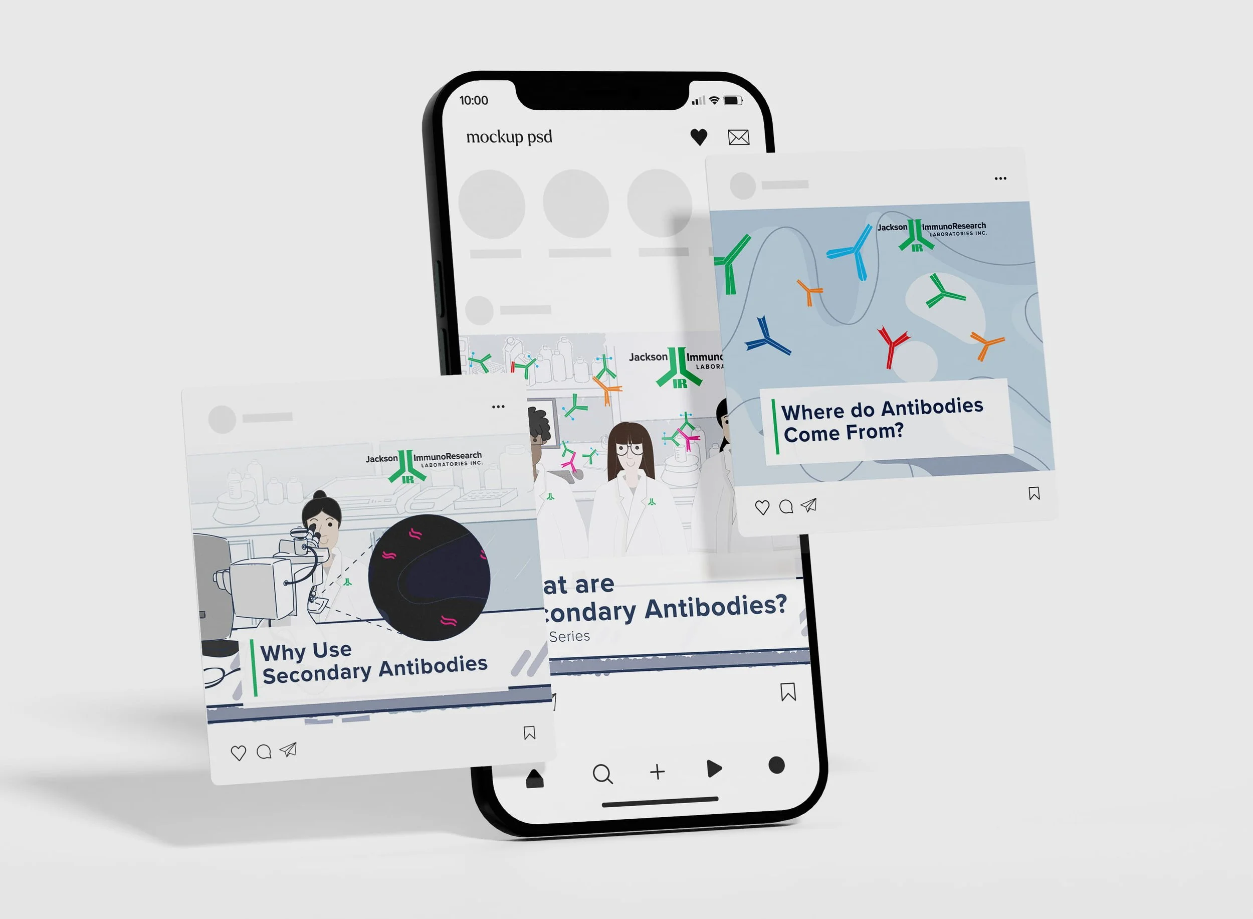 The goal of the campaign was to provide an overview of what Secondary Antibodies are and how they can benefit scientists, as a way to introduce Jackson ImmunoResearch’s new website and highlight their specialty—secondary antibodies. The centerpiece of the campaign was the animation. I wanted the animation to reflect the care and intentionality that goes into Jackson’s antibodies, as well as some of their humanity, which is why I opted for a handmade aesthetic and detailed, custom assets.
