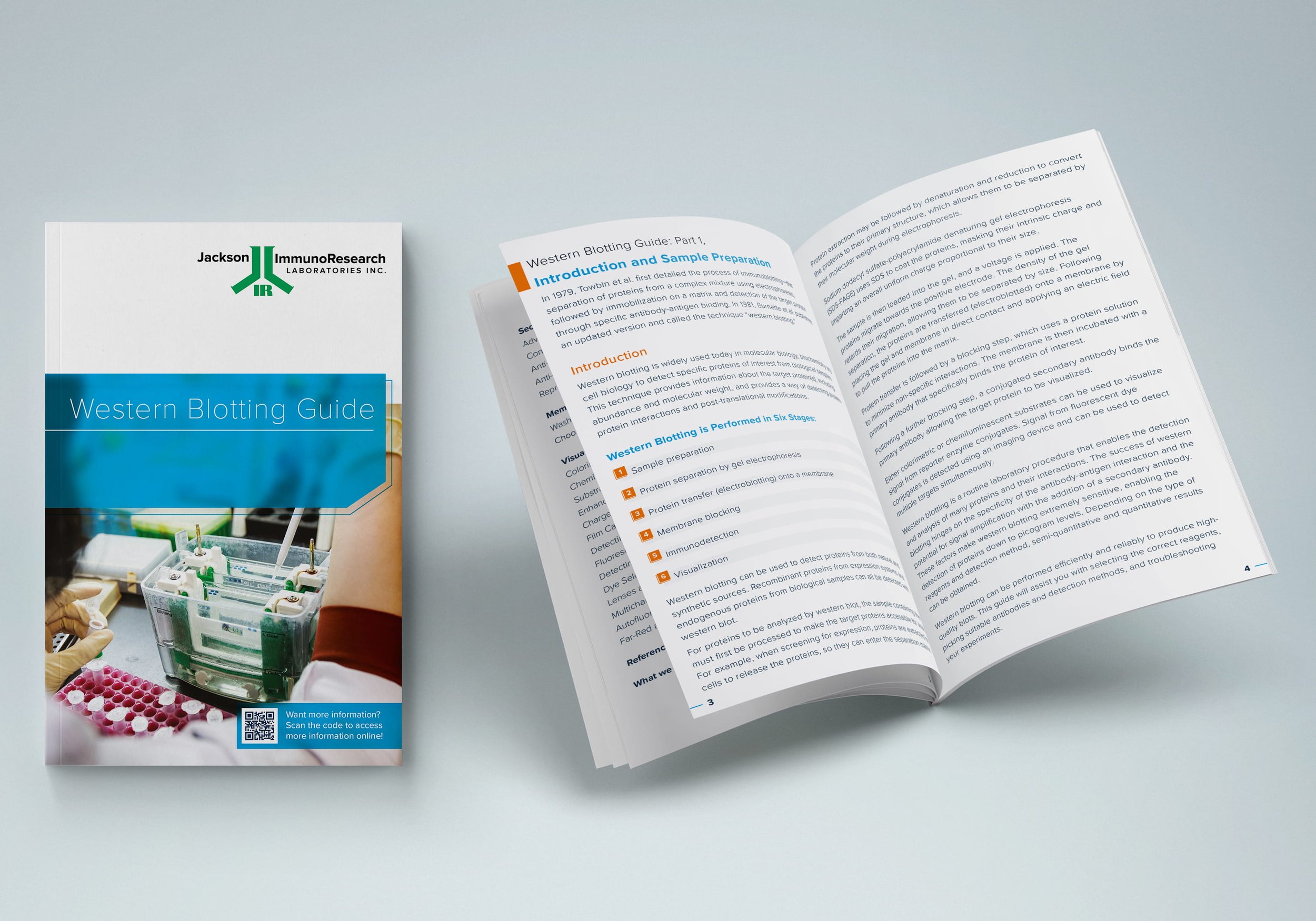 The Western Blotting Guide for Jackson ImmunoResearch is a 66 page perfect-bound informational booklet. It has physical weight to it, and the silk cover stock ensures a pleasing textural experience when handled. The booklet itself contains detailed descriptions of best practices for western blotting. The goal was to design a booklet that is usable, and has a contemporary but also pragmatic feel. Through the use of simple shapes, limited colors, kerning and leading I created an easy to read and value-packed booklet that functions as a unique and memorable item at exhibitions and conferences.